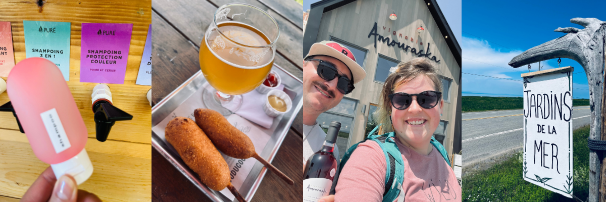 Tant qu’à être dans le coin, à 3 minutes en auto du vignoble, on est allé remplir nos contenants de voyage chez Pure. Nous avons pris le savon pour le corps au thé vert et le shampooing poire/cerise (pour cheveux colorés), nous avions déjà le soin démêlant pour cheveux dans notre trousse.
